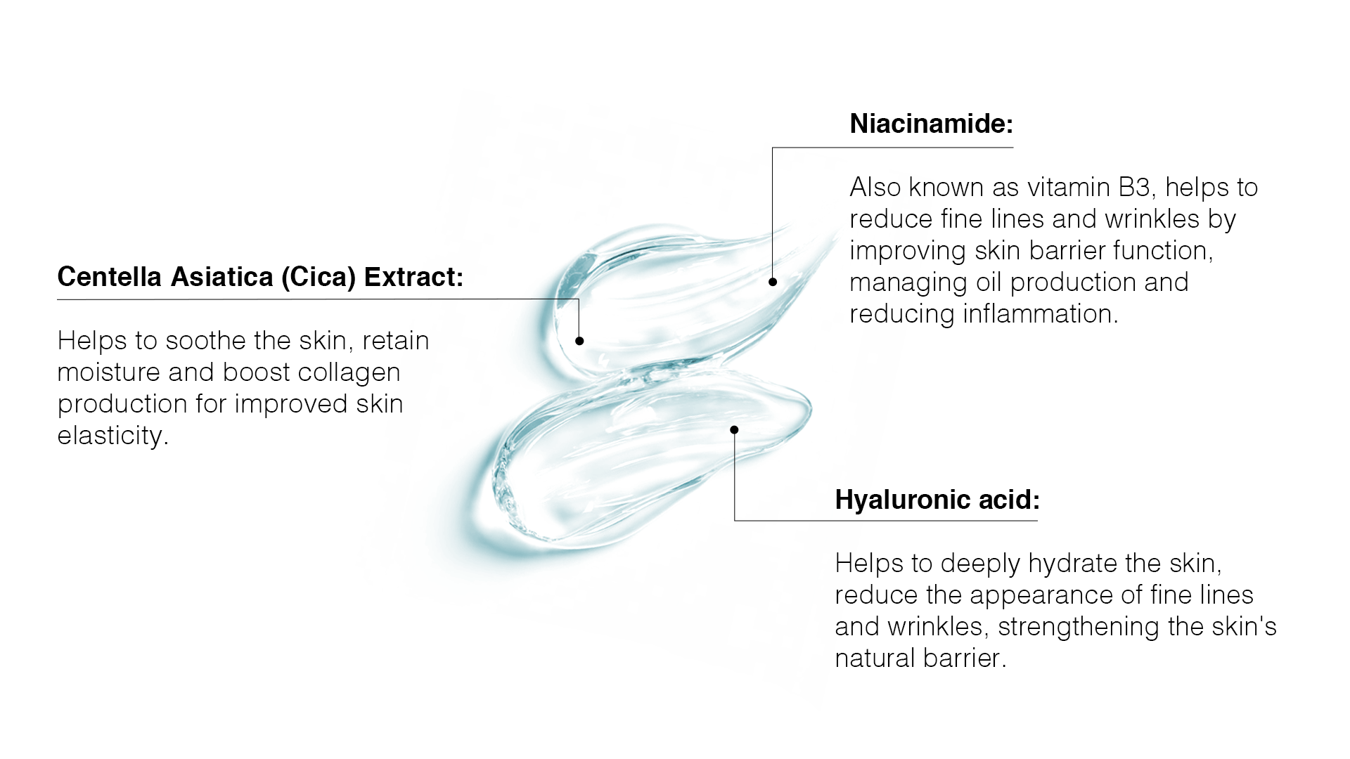 Aqua, Cyclopentasiloxane, Dimethicone, Glycerine, Niacinamide, Acrylates/C10-30 Alkyl Acrylate Crosspolymer, Phenoxyethanol, Cetearyl Olivate (And) Sorbitan Olivate, Glyceryl Stearate (And) PEG-100 Stearate, Cetyl Alcohol, (Dimethyl-Dimethyl) Hydantoin, Hyaluronic Acid, Aloe Vera Extract, Perfume, Centella Asiatica (Cica) Extract, Tocopherol, Panthenol, CI 42090